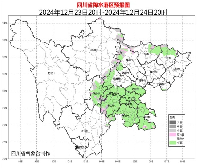 23日晚上到24日白天:盆地各市阴天间多云,雅安、眉山、乐山、资阳、内江、自贡、宜宾、泸州8市和广元、巴中2市北部及西部沿山有分散小雨或零星小雨,高海拔地区有雨夹雪或小雪;川西高原和攀西地区以晴间多云天气为主。