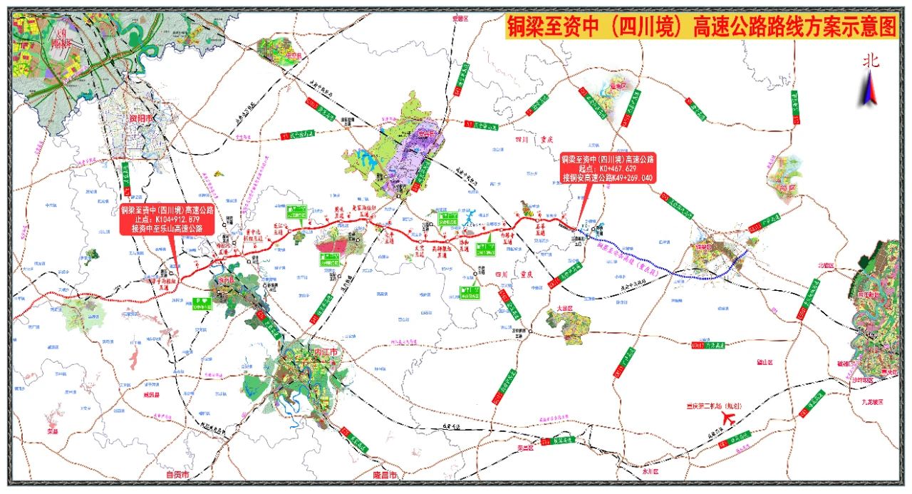 资中至铜梁(四川境)高速公路是党中央、国务院《成渝地区双城经济圈建设纲要》确定的重点项目,项目实施对于促进成渝地区中部崛起、构建国家综合立体交通极、服务支撑成渝地区双城经济圈建设具有重要意义。项目路线起于内江市资中县,接G76厦蓉高速公路,对接在建的资中至乐山高速公路,经马鞍镇、龙江镇,安岳县周礼镇,止于石羊镇川渝界处,接建成通车的铜梁至资中高速公路重庆段,全长105公里。全线采用双向六车道高速公路标准建设,设计速度120公里/小时,总投资202亿元。